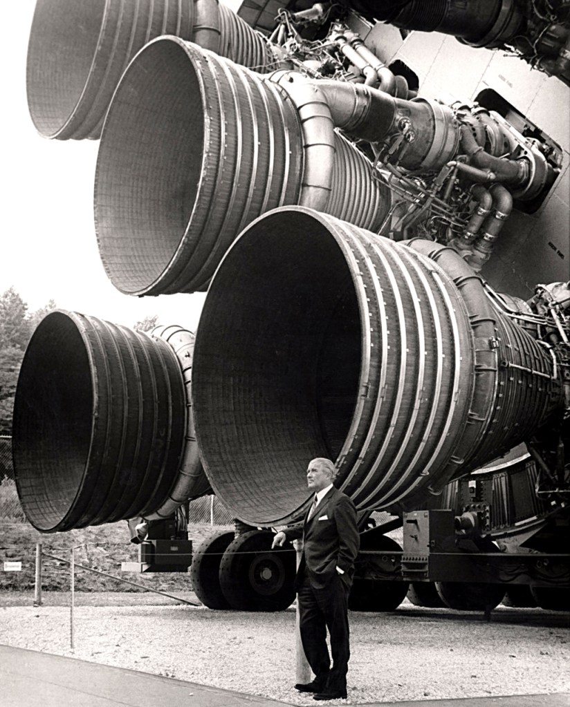 Cruciale per la riuscita del programma Apollo fu inoltre la partecipazione di alcuni tra i maggiori gruppi industriali dell’epoca come, ad esempio, la North American Aviation e la Grumman, rispettivamente vincitrici degli appalti per i moduli di Comando e Lunare. Non meno trascurabile si rivelò il contributo offerto dai colossi della Douglas Aircraft Company, della Boeing e della IBM, incaricati di sviluppare il vettore missilistico Saturn V. Partorito dalle menti eccelse di Wernher von Braun (1912-1977) e del collega Arthur Rudolph (1906-1996), entrambi passati alla NASA dopo una breve collaborazione con l’Army Ballistic Missile Agency di Madison County,[6] l’intero progetto era stato realizzato in parallelo alla famiglia dei lanciatori orbitali Nova, rispetto alla quale si differenziava per la minore complessità.