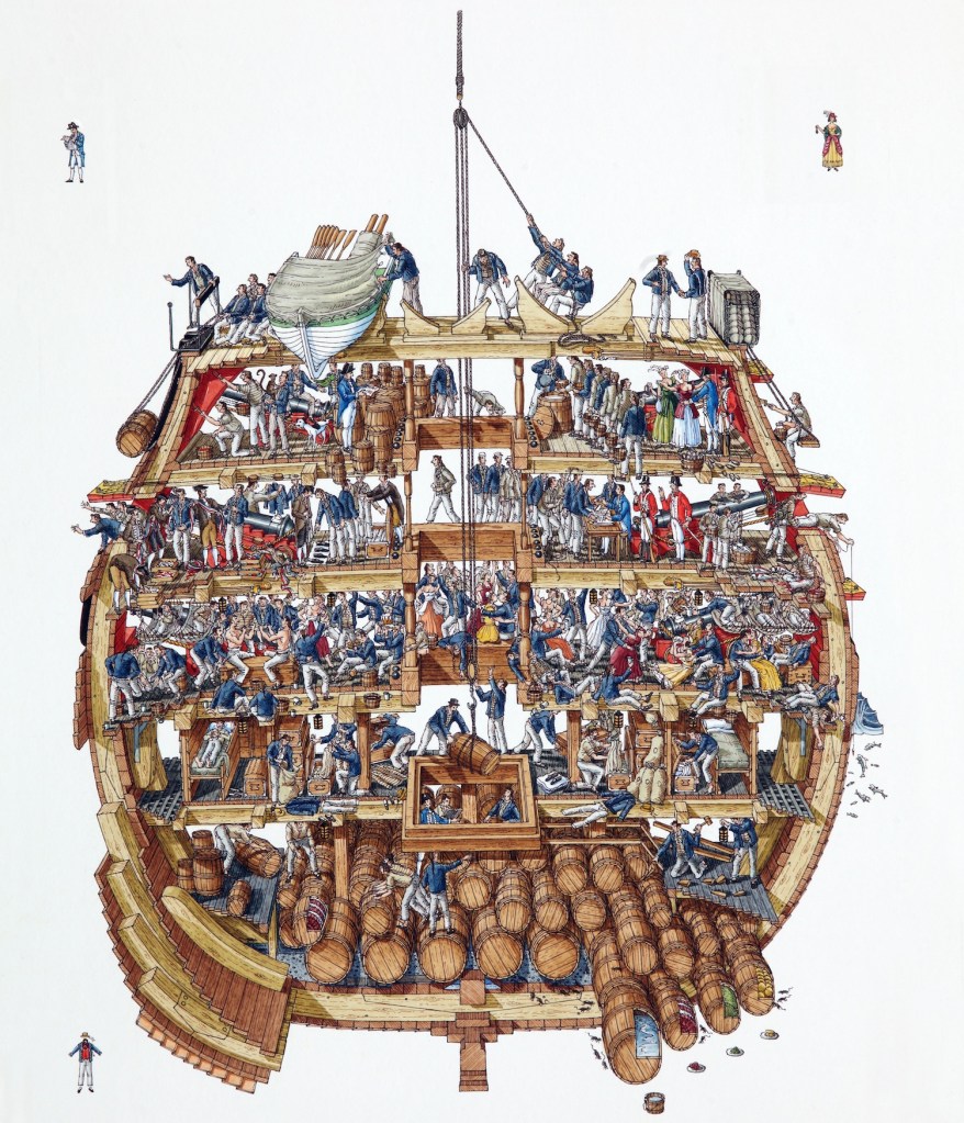 Dunque ecco lo scenario: oltre 700 uomini ammucchiati come bestie, con turni di guardia massacranti e indifferenti alle condizioni atmosferiche. Anzi, quando la nave incontrava burrasca le guardie erano raddoppiate, perché erano richieste più mani per le manovre. E con il maltempo o in combattimento non si potevano tenere accesi i fuochi in cucina per cui, passato il pericolo, porco salato, piselli secchi e gallette (che era ormai invalso battere su tavolato per far uscire i vermi che le infestavano)[3].