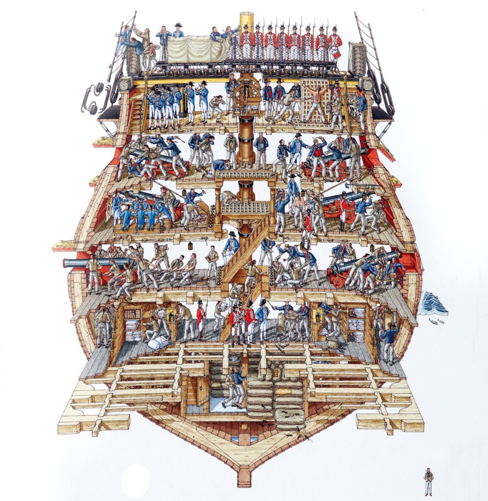 La HMS Victory, nave ammiraglia di Nelson, è un vascello di prima classe da 104 cannoni, tre ponti e un dislocamento di 3.556 tonnellate. È l’unica nave delle guerre napoleoniche ancora nel ruolino della Royal Navy, benché per sempre all’ormeggio. Aveva un equipaggio di 800 uomini fra ufficiali, sottufficiali e comuni. In un’area di oltre 22.000 metri cubi si ammassavano barili di cibo conservato, serbatoi di acqua, materiali di rispetto quali cordami, vele, alberi di gabbia, tronchetti, munizioni, palle di cannone e, infine, gli esseri umani.